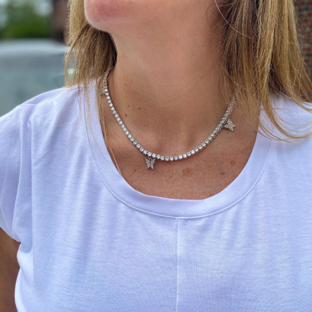 The perfect icy Tennis Necklace is here! The Premium Tennis Necklace has butterflies perfectly placed to dance like fire! This chain will have you looking like you're at the top of the charts! This piece goes perfectly with any outfit